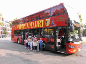 Am Montag, den 2. Juni, war es endlich so weit: 55 Kinder und ihre Erzieherinnen und Erzieher machten sich auf zu einer spannenden Entdeckungstour durch Leipzig – in einem riesigen, roten Doppelstockbus! Start war um 9:00 Uhr am Eutritzscher Markt. Schon beim Einsteigen war die Aufregung groß: Ein Bus mit zwei Etagen, offenem Dach und bester Sicht auf alles, was Leipzig zu bieten hat. Unser Stadtführer Sören begleitete uns mit vielen kindgerechten Geschichten und interessanten Fakten über bekannte und unbekannte Gebäude, Plätze und Denkmäler. Besonders aufregend war der Blick von oben auf die kleinen Autos und das Gefühl des Fahrtwinds im Haar. Während der Fahrt hatten die Kinder eine besondere Aufgabe: Ausschau halten nach den Leipziger Stadtfarben Blau und Gelb – und nach dem Wappentier, dem Löwen. Und siehe da: Der Löwe war überall zu entdecken – an Häuserwänden, auf Fahrzeugen oder Schildern. Es war ein erlebnisreicher Vormittag, bei dem alle Kinder nicht nur viel Spaß hatten, sondern auch ihre Stadt aus einer neuen Perspektive kennengelernt haben.